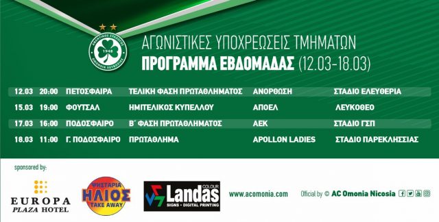 Απόψε η ομάδα πετόσφαιρας αντιμετωπίζει τον Παφιακό και θέλει την νίκη για να παραμείνει στη διεκδίκηση του πρωταθλήματος. Την Πέμπτη η ομάδα φούτσαλ δίνει τον πρώτο ημιτελικό αγώνα κυπέλλου απέναντι στον Αποέλ και θα επιδιώξει να θέσει τις βάσεις για πρόκριση στον τελικό. Το Σάββατο η ποδοσφαιρική ομάδα φιλοξενεί την ΑΕΚ στο ΓΣΠ, με στόχο την πρώτη νίκη στην Β’ φάση του πρωταθλήματος. Τελευταίος αγώνας στη βδομάδα είναι αυτός της γυναικείας ομάδας, η οποία την Κυριακή αντιμετωπίζει την Apollon Ladies, με στόχο το καλύτερο δυνατό αποτέλεσμα.