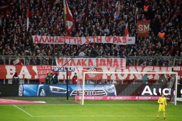 Χαιρετίσματα από τους οργανωμένους της Μπάγερν Μονάχου στον Ιωνά και σε όσους στηρίζουν και ψήφισαν τα μέτρα καταστολής και φακελώματος. Σε αυτό τον αγώνα δεν είμαστε μόνοι, σε αυτό τον αγώνα δεν κάνουμε βήμα πίσω. Μίσος για όλους όσους θέλουν να μας κόψουν το γήπεδο, σύγκρουση με τα συμφέροντα του Ιωνά και των λαμογιών που σκοτώνουν το ποδόσφαιρο.