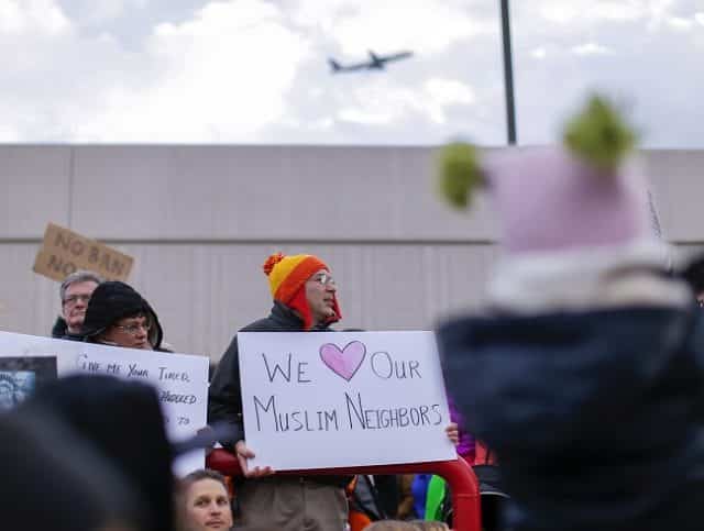Περίπου 200 διαδηλωτές φώναζαν συνθήματα χθες το απόγευμα στο Διεθνές Αεροδρόμιο Dulles στη βόρεια Βιρτζίνια, κοντά στη Ουάσιγκτον. Ο ίδιος περίπου αριθμός ατόμων συγκεντρώθηκε στο Διεθνές Αεροδρόμιο John F. Kennedy στη Νέα Υόρκη, όπου ανήσυχα μέλη οικογενειών περίμεναν συγγενείς που είχαν βρεθεί υπό κράτηση για ώρες μετά από πτήσεις από χώρες που επηρεάζονται από την προεδρική διαταγή.