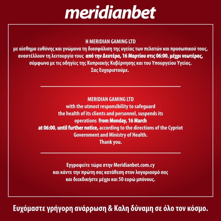 MERIDIAN GAMING LTD, with a sense of responsibility and with a view to ensuring the health of it’s customers and employees, suspends the operation of it’s betshops from March 16 until 06:00, until further notice, in accordance with the Cypriot instructions. and the Ministry of Health.