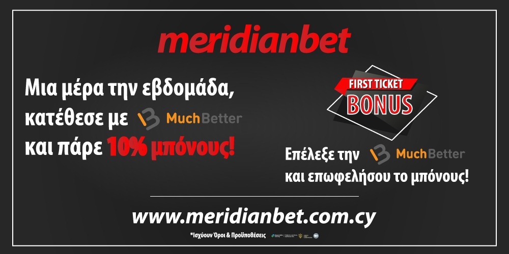 Επιλέξτε την Muchbetter ως μέθοδο πληρωμής για κατάθεση του Meridianbet λογαριασμού σας, στοιχηματίστε και προσθέστε επιπλέον 10% στο λογαριασμό του Μπόνους σας.