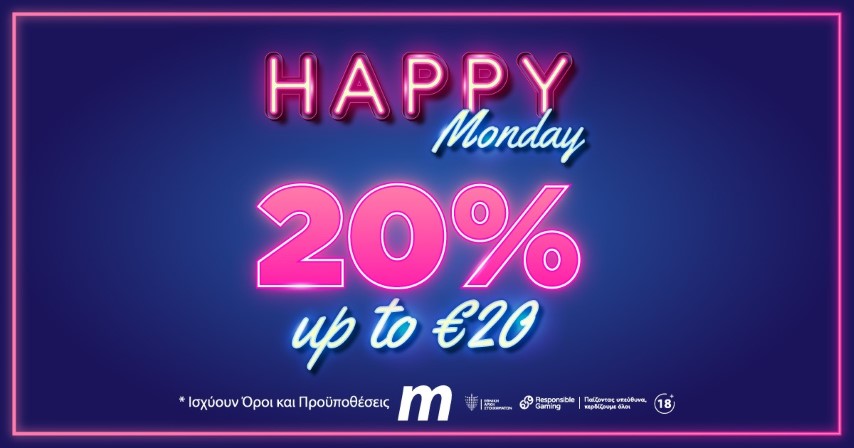 Μια εκπληκτική προσφορά κάθε Δευτέρα σας περιμένει στην Meridianbet!  Κερδίστε ένα 20%  στην κατάθεση σας μέγιστο ποσό που μπορεί να λάβει ένας πελάτης ως μπόνους από αυτήν την προσφορά είναι 20 €!