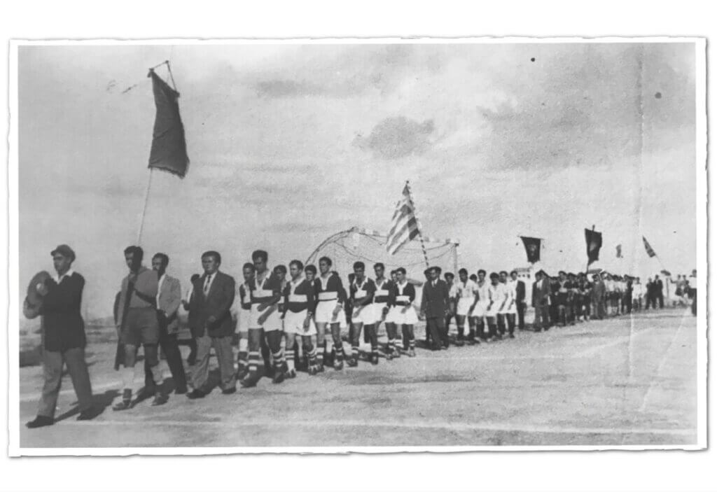 Η φωτογραφία είχε ληφθεί το 1950. Βλέπουμε τα σωματεία της ΚΕΠΟ να εγκαινιάζουν τη νέα αγωνιστική περίοδο με πρωτάθλημα Σέβεν-Α-Σάιτ που διεξήχθη στο Δημοτικό Στάδιο Αμμοχώστου.