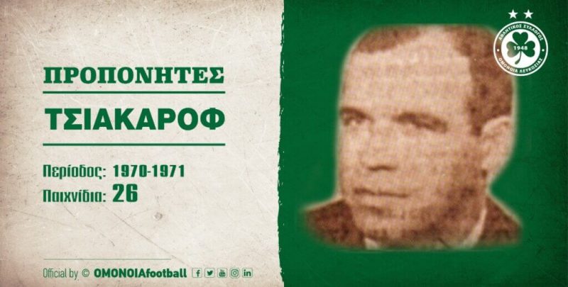 Ο Bούλγαρος τεχνικός, Τσιακάροφ, έκατσε στον πάγκο της ομάδας μας την αγωνιστική περίοδο 1970-71 και σε σύνολο 26 αγώνων που ηγήθηκε μέτρησε 14 νίκες, 3 ισοπαλίες και 9 ήττες σε όλες τις διοργανώσεις.