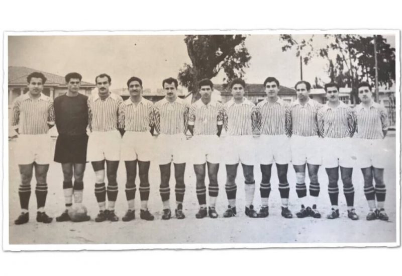 Η ΟΜΟΝΟΙΑ της περιόδου 1956-57. Από αριστερά: Γεωρκάτζιης, Εξαδάκτυλος, Ψύλλος, Γιάννος, Ψύλλος, Μ. Χριστοφή, Χ. Σαββίδης, Τάκης, Λυμπουρής, Φοίβος, Κακουλλής.