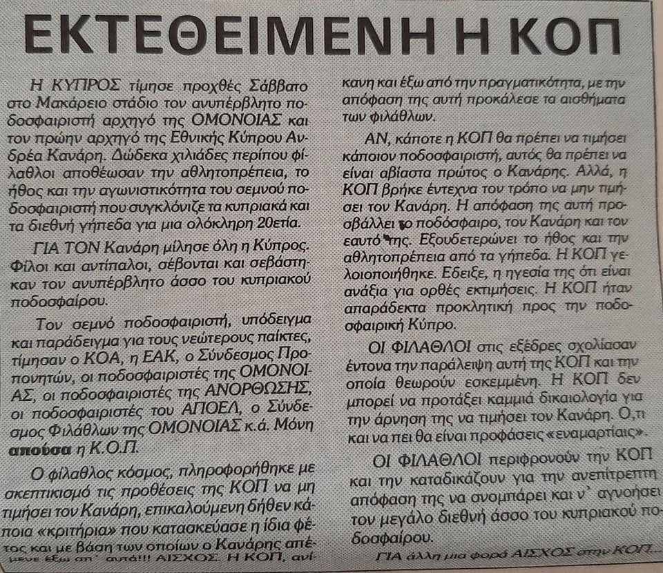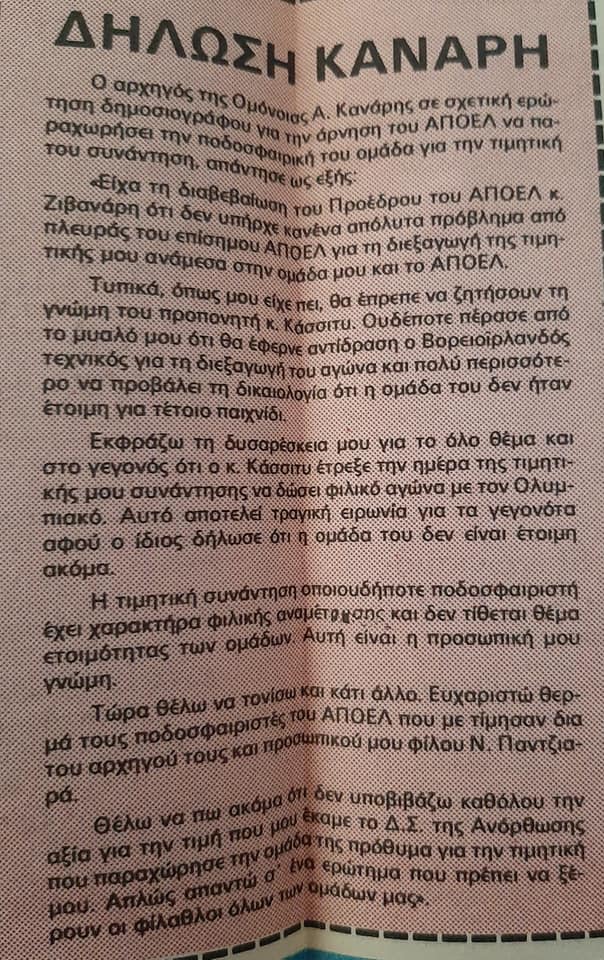 Σαν σήμερα πριν ακριβώς 36 ΧΡΟΝΙΑ (24/08/1985), ο παλαίμαχος ποδοσφαιριστής της ΟΜΟΝΟΙΑΣ, ο μεγάλος Ανδρέας Κανάρης κρέμασε τα παπουτσιά του.