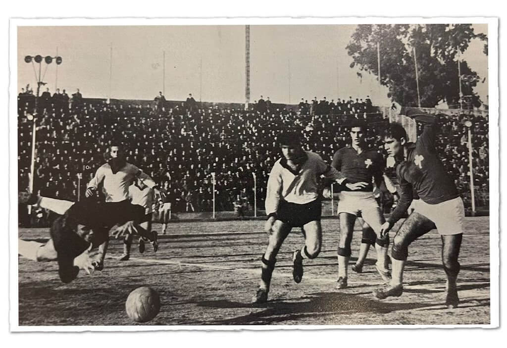 Στο φωτογραφικό στιγμιότυπο βλέπουμε τον Αντωνάκη Γρηγορίου να επιχειρεί το σουτ και τον τερματοφύλακα της ΕΠΑ, Αλκιβιάδη, να αποκρούει, ενώ πίσω διακρίνεται και ο Δρόσος Καλοθέου.