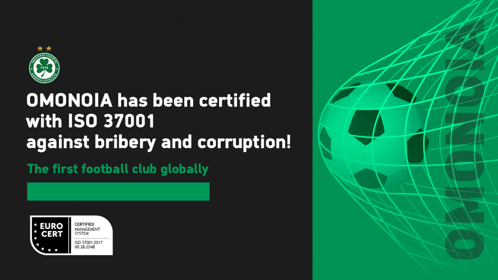 Η ΟΜΟΝΟΙΑ έγινε ο πρώτος ποδοσφαιρικός Σύλλογος στον κόσμο που επίσημα έχει λάβει την πιστοποίηση ISO 37001 – Σύστημα Διαχείρισης κατά της Δωροδοκίας.