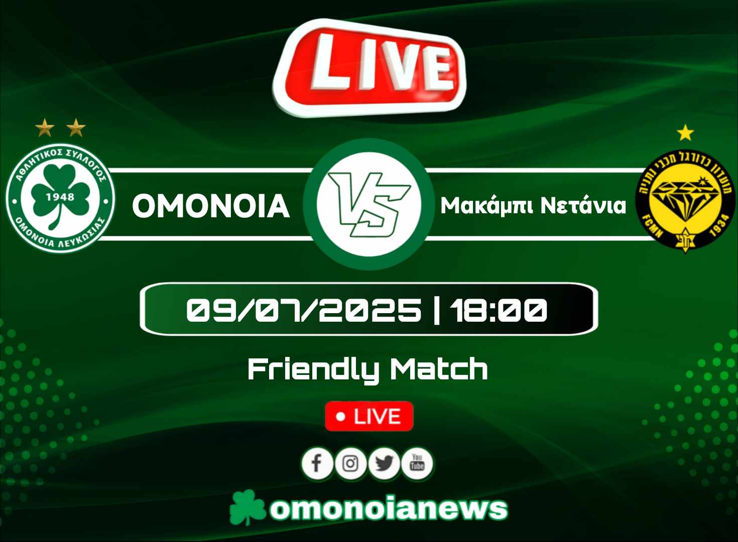 Η ΟΜΟΝΟΙΑ αντιμετωπίζει στις 18:00 την Μακάμπι Νετάνια. Το παιχνίδι μεταδίδεται τηλεοπτικά από το ΟΜΟΝΟΙΑ TV.