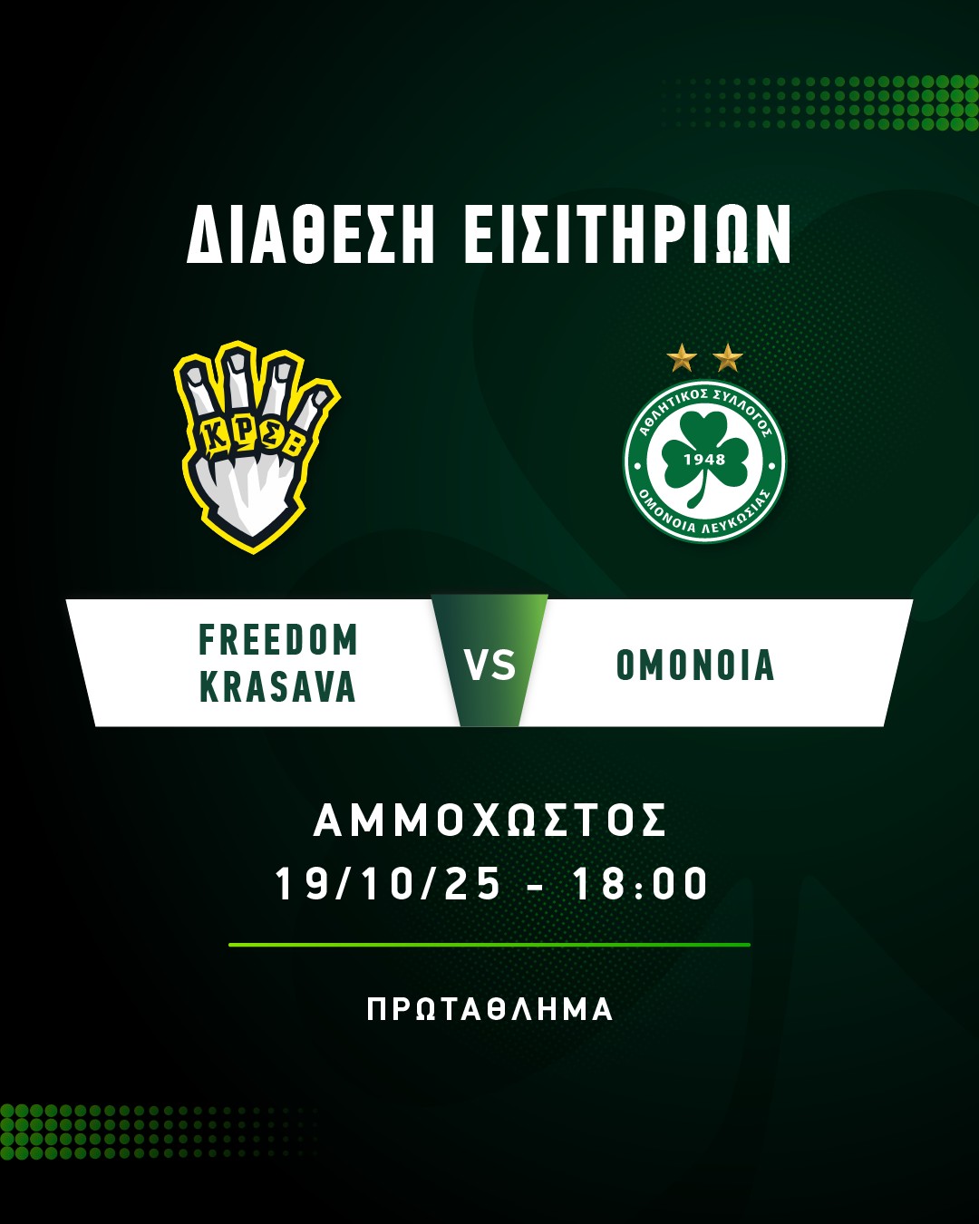 Από την Τρίτη, 14 Οκτωβρίου, στις 10:00, διατίθενται τα εισιτήρια του αγώνα με αντίπαλο την Freedom24 Krasava Ε.Ν.Υ, για την 7η αγωνιστική του πρωταθλήματος, που θα διεξαχθεί στο στάδιο “Αμμόχωστος – Επιστροφή”.