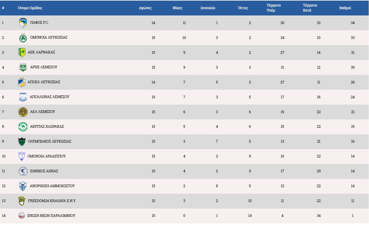 Με τις δύο αναμετρήσεις των ομάδων που είχαν Ευρωπαϊκές υποχρεώσεις την περασμένη Πέμπτη δόθηκε η συνέχεια στην 15η αγωνιστική, στην οποία εκκρεμεί το παιχνίδι της Πάφου με τον Αποέλ το οποίο αναβλήθηκε λόγω ακαταλληλότητας του αγωνιστικού χώρου του «Στέλιος Κυριακίδης».