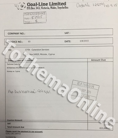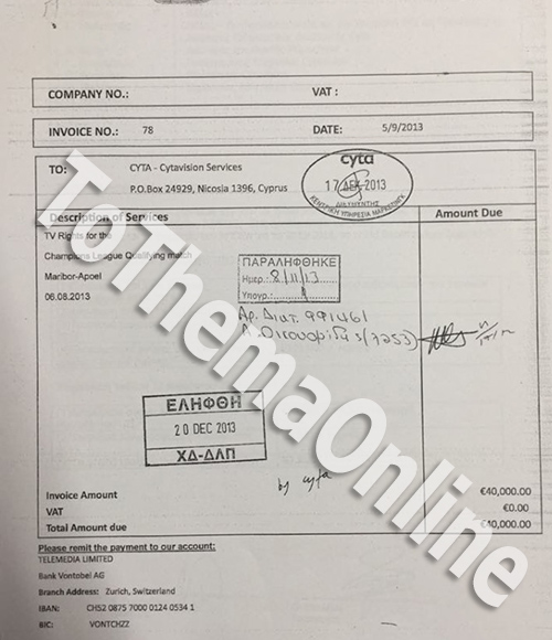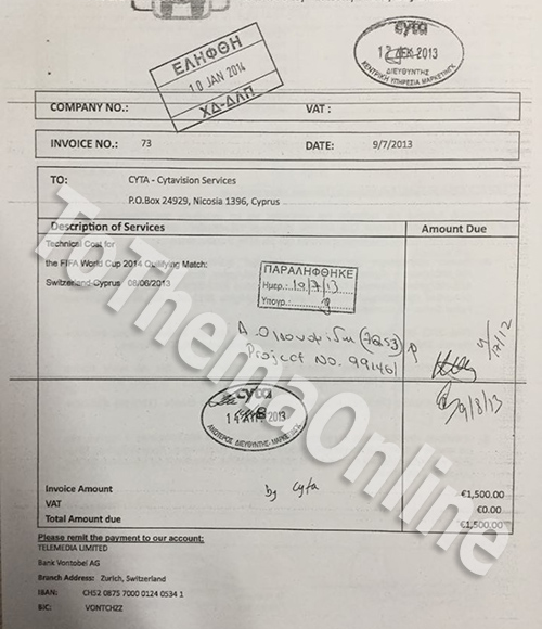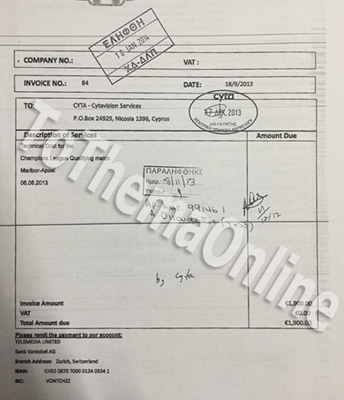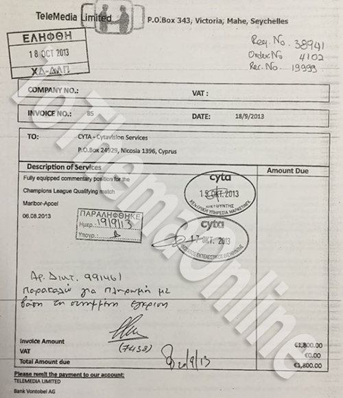 Όπως φαίνεται από τα έγγραφα που παρουσιάζουμε για πρώτη φορά σήμερα, το 2013 και ενόσω ο κ. Κούμας ήταν αναπληρωτής πρόεδρος της Ομοσπονδίας, πώλησε στη CytaVisioν τα τηλεοπτικά δικαιώματα του αγώνα Μάριμπορ – ΑΠΟΕΛ για τα προκριματικά του Τσάμπιονς Λιγκ. Το τηλεοπτικό κανάλι του ημικρατικού οργανισμού κατέβαλε τη συγκεκριμένη χρονιά 43.700 ευρώ για τον εν λόγω εκτός έδρας αγώνα των γαλαζοκιτρίνων. Συγκεκριμένα, χρέωσε 40.000 για τα δικαιώματα, 1.900 ευρώ ως τεχνικό κόστος της μετάδοσης και άλλες 1.800 ευρώ ως έξοδα σχολιασμού. Το άλλο έγγραφο που παρουσιάζουμε (βλ. πιο κάτω) παρουσιάζει δοσοληψίες του κ. Κούμα με τη CytaVision για τηλεοπτικά δικαιώματα που αφορούν μεταξύ άλλων τον εκτός έδρας αγώνα της Κύπρου με την Νορβηγία για τα προκριματικά του Euro 2012, αλλά και το Ελβετία – Κύπρος για τα προκριματικά του Μουντιάλ 2014.