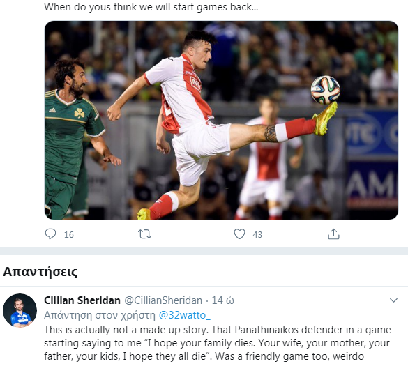 Ο Ιρλανδός υποστηρίζει πως, στο φιλικό παιχνίδι της ΟΜΟΝΟΙΑΣ με τον Παναθηναϊκό, τον Αύγουστο του 2016, ο Κουτρουμπής εκστόμισε απίστευτα πράγματα προς τον Σέρινταν.