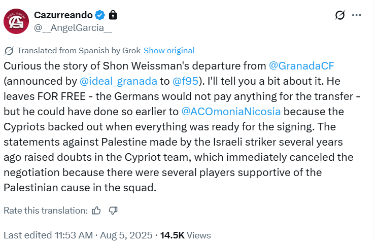 «Περίεργη η ιστορία της αποχώρησης του Σον Βάισμαν από τη Γρανάδα . Σας λέω λίγα παραπάνω. Φεύγει ΔΩΡΕΑΝ –οι Γερμανοί δεν θα πλήρωναν τίποτα για τη μεταγραφή– αλλά μπορούσε να το είχε κάνει νωρίτερα στην Ομόνοια Λευκωσίας, καθώς οι Κύπριοι έκαναν πίσω όταν όλα ήταν έτοιμα για την υπογραφή. Οι δηλώσεις κατά της Παλαιστίνης που είχε κάνει ο Ισραηλινός επιθετικός πριν από μερικά χρόνια δημιούργησαν αμφιβολίες στην κυπριακή ομάδα, η οποία ακύρωσε αμέσως τη διαπραγμάτευση επειδή υπήρχαν αρκετοί παίκτες που ήταν υπέρ της παλαιστινιακής υπόθεσης στο ρόστερ».