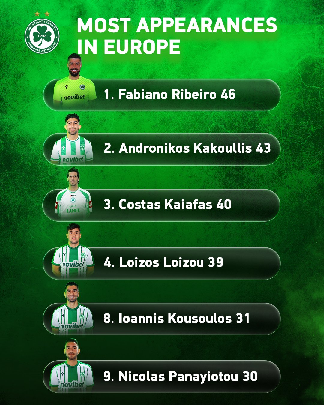 Ο Φαμπιάνο συνεχίζει να διατηρεί την πρωτιά και να αυξάνει τις συμμετοχές του φτάνοντας στις 46. Ακολουθούν οι Κακουλλής με 43, Καϊάφας με 40 και ο Λοΐζου έφτασε στις 39 και εάν αγωνιστεί στα δύο επόμενα ματς θα προσπεράσει τον αιώνιο αρχηγό.