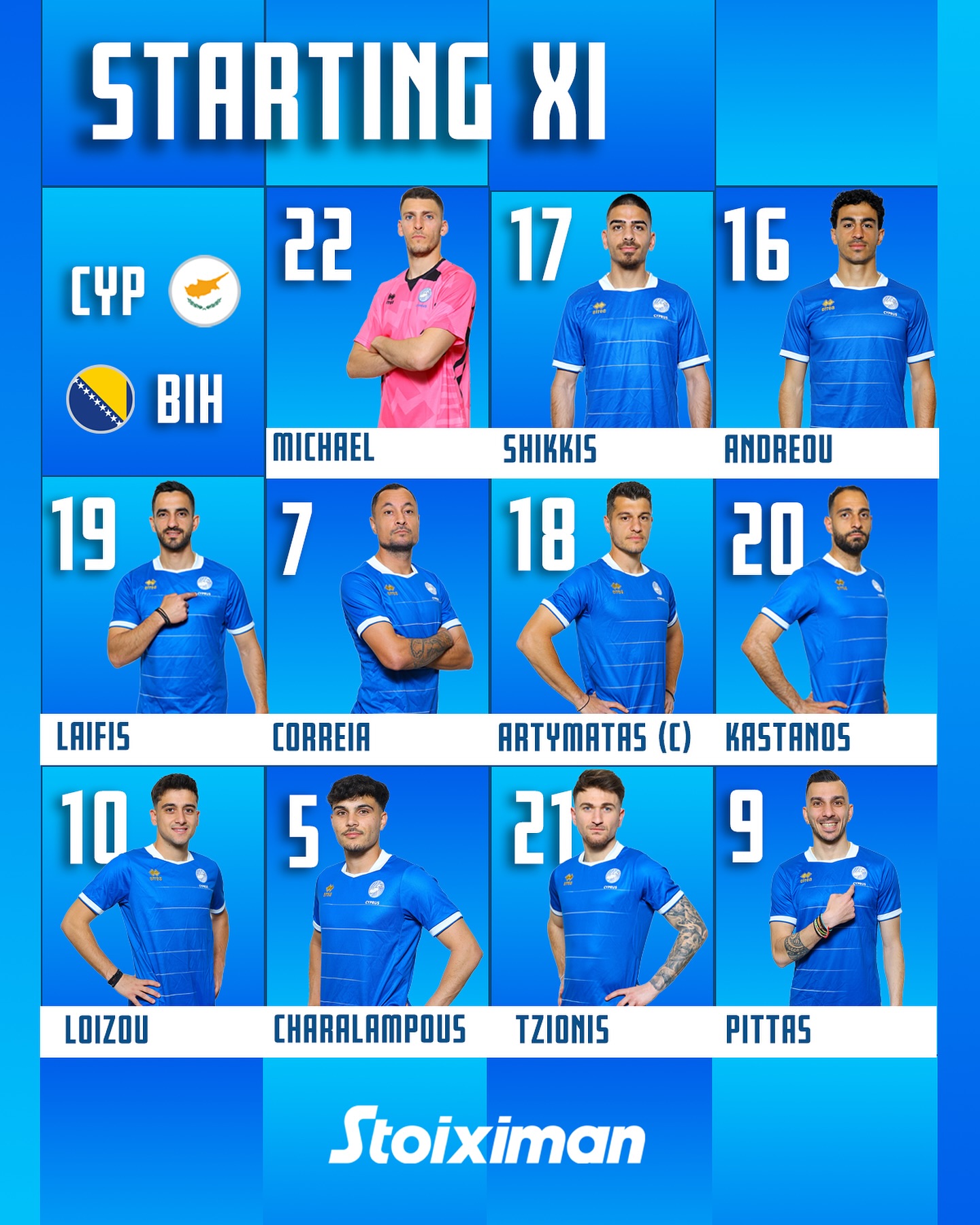 Η αρχική ενδεκάδα της Εθνικής Κύπρου στον αγώνα με αντίπαλο την Βοσνία στην ΑΕΚ Αρένα για τα προκριματικά του Παγκοσμίου Κυπέλλου.