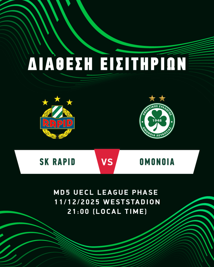 Από την Τρίτη, 11 Νοεμβρίου, στις 11:00, διατίθενται τα εισιτήρια για τον αγώνα με την SK Rapid, που θα διεξαχθεί στο στάδιο «Weststadion», στην Βιέννη, την Πέμπτη, 11 Δεκεμβρίου, στις 21:00 (τοπική ώρα), στο πλαίσιο της 5ης αγωνιστικής της League Phase του UEFA Conference League.