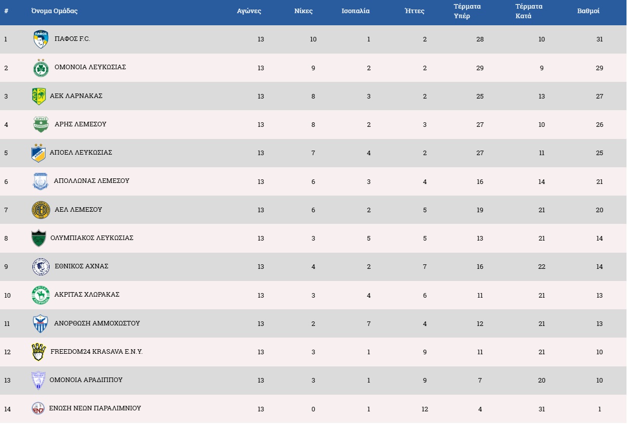 -Η Ομόνοια Λευκωσίας διαθέτει και την καλύτερη άμυνα με 9 τέρματα παθητικό ενώ η Πάφος F.C. και ο Άρης δέχτηκαν από 10 τέρματα.