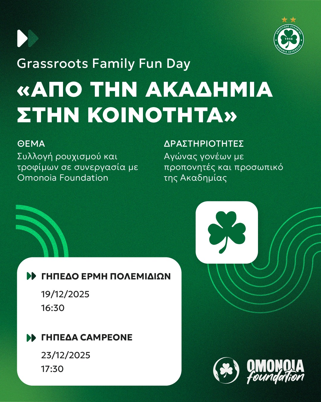 Η Ακαδημία της ΟΜΟΝΟΙΑΣ σε συνεργασία με το Omonoia Foundation διοργανώνει Fun Days για τα Κλιμάκια Grassroots σε Λευκωσία και Λεμεσό με σκοπό την συλλογή ρουχισμού και τροφίμων τα οποία θα παραδοθούν σε ιδρύματα πριν τα Χριστούγεννα!