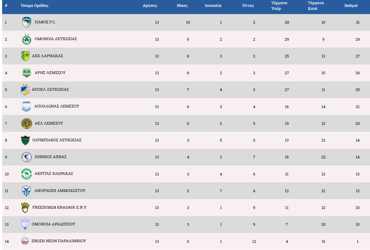 Με τρία παιχνίδια την Κυριακή ολοκληρώθηκε η 13η αγωνιστική και ο Α’ Γύρος της Cyprus League by Stoiximan.