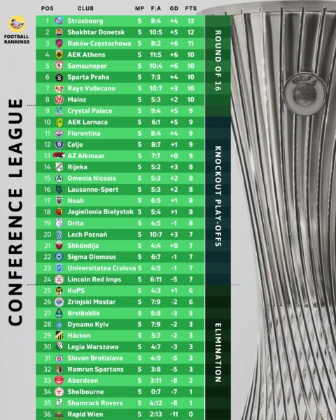 Η βαθμολογική εικόνα της League Phase στο UEFA Conference League αρχίζει πλέον να ξεκαθαρίζει, με τα όρια πρόκρισης να διαμορφώνονται πιο καθαρά μετά και τις τελευταίες αγωνιστικές.