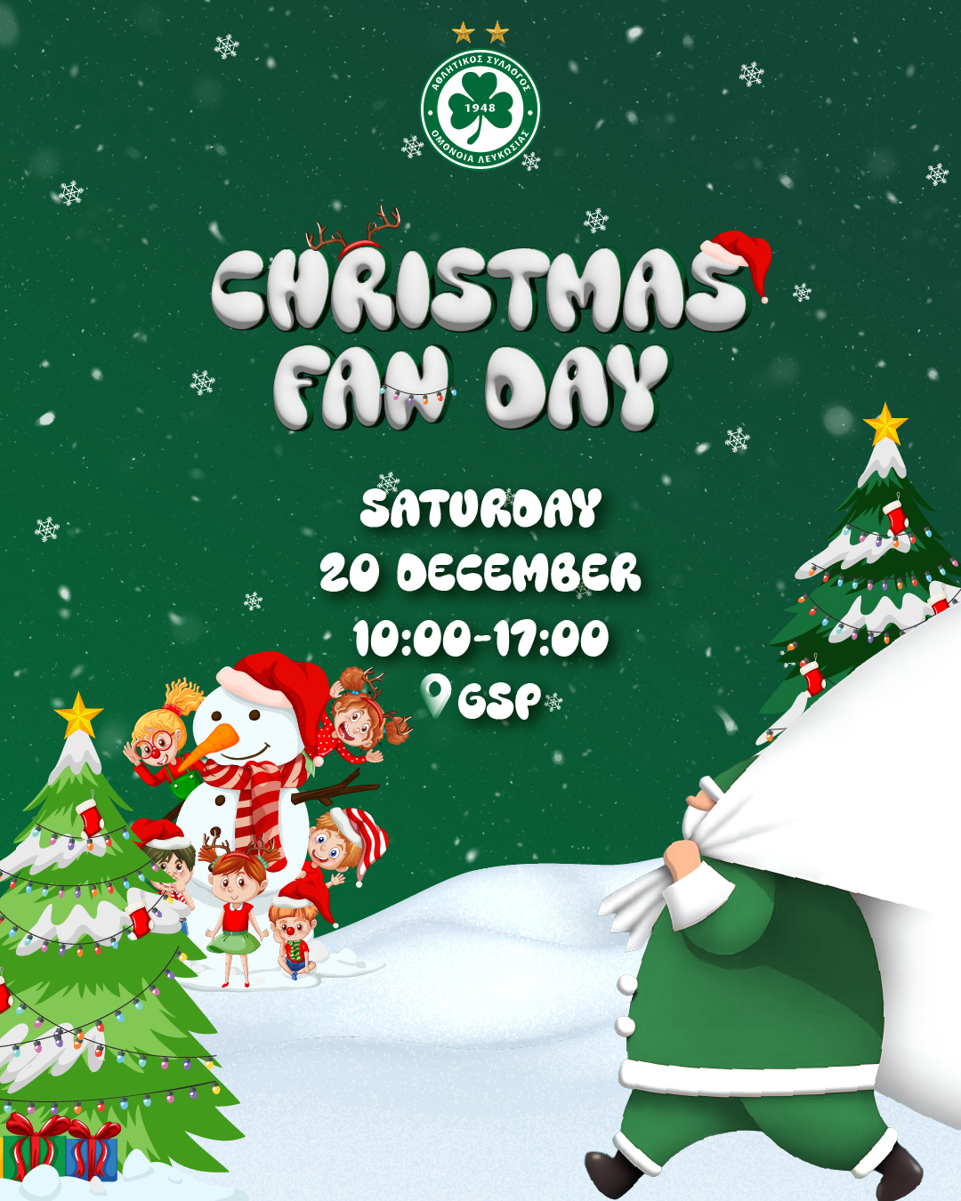 Το Χριστουγεννιάτικο Fan Day της ΟΜΟΝΟΙΑΣ είναι προγραμματισμένο για σήμερα το Σάββατο 20 Δεκεμβρίου, στο στάδιο ΓΣΠ, από τις 10:00 το πρωί μέχρι τις 17:00 το απόγευμα.