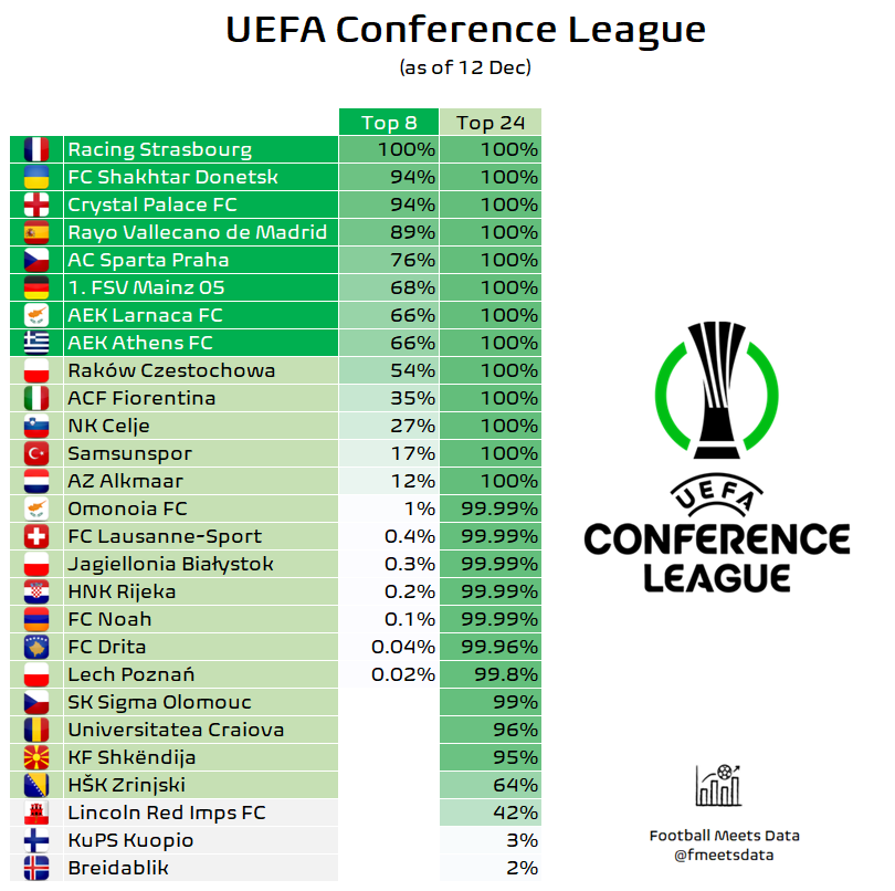 Τις πιθανότητες πρόκρισης για κάθε ομάδα έδωσε ο αλγόριθμος του Football Meets Data μετά την ολοκλήρωση της 5ης αγωνιστικής στην League Phase του Conference League.
