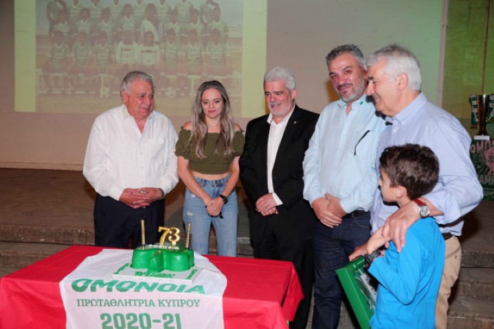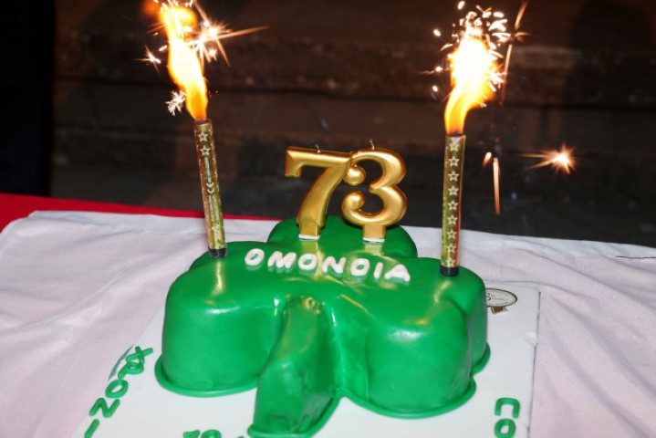 Υπό τον ήχο του ΥΜΝΟΥ της ομάδας μας, ο Αναπληρώτης Πρόεδρος της ΟΜΟΝΟΙΑΣ, Δημήτρης Γρηγόρη, ο Πρόεδρος του Σωματείου, Μάριος Αργυρίδης, ο Πρόεδρος της ομάδας του 1987, Κωστάκης Κωνσταντίνιδης και ο Πρόεδρος των Παλαιμάχων, Νίκος Πατίκκης. έσβησαν την τούρτα με το 73.