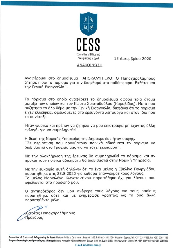 Ο Πρόεδρος της Επιτροπής Δεοντολογίας και Προστασίας του Αθλητισμού, Ανδρέας Παπαχαραλάμπους με ανακοίνωση του δίνει εξηγήσεις για το γεγονός πως ζήτησε πίσω το πόρισμα που παρέδωσε στη Γενική Εισαγγελία.