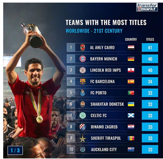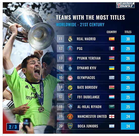 Σε μία από αυτές, τις πιο πρόσφατες, του γνωστού Transfermarkt, ο Ολυμπιακός είναι μέσα στους 15 κορυφαίους συλλόγους στον πλανήτη σε κατακτήσεις τίτλων μέσα στον 21ο αιώνα! Με 25, δηλαδή 17 πρωταθλήματα, εφτά κύπελλα κι ένα Σούπερ Καπ! Ο Ολυμπιακός είναι οριακά πάνω από τη Μάντσεστερ Γιουνάϊτεντ και την Μπόκα Τζούνιορς και καθαρά πίσω από Μπάγερν, Μπαρτσελόνα, Πόρτο, Ρεάλ και Παρί Σεν Ζερμέν. Με διαφορά στήθους από την Μπάγερν κορυφαία σε τίτλους η Αλ Αχλί της Αιγύπτου!