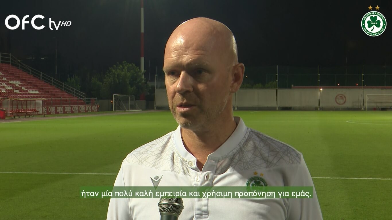 Ποιο το πλάνο μας για τη συνέχεια της προετοιμασίας; «Θα συνεχίσουμε κανονικά. Βρισκόμαστε στη μέση της προετοιμασίας, δώσαμε ένα καλό παιχνίδι κι έχουμε άλλο ένα για την υπόλοιπη ομάδα. Θα είναι κι αυτό ένα σημαντικό φιλικό. Πλησιάζουμε στο 100 % της φυσικής μας κατάστασης. Πρέπει να βρούμε ρυθμό, να αναπτυσσόμαστε, να συνεχίσουμε να μαθαίνουμε και να βελτιωνόμαστε ως ομάδα. Αυτό είναι το επόμενο βήμα για εμάς για πλησιάσουμε στο επίπεδο των Ευρωπαϊκών αγώνων και για αυτό τον λόγο το σημερινό παιχνίδι ήταν μία καλή προετοιμασία».