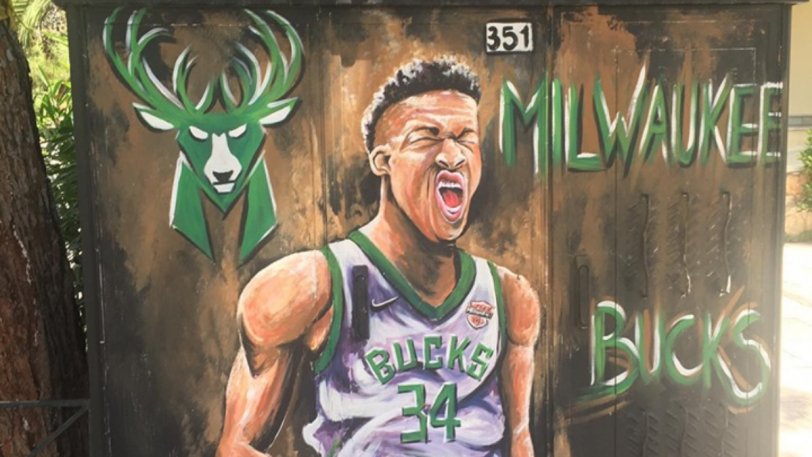 Ο «Greek Freak» φορούσε την φανέλα των Μπακς, ένα ελάφι, το σήμα της ομάδας, ήταν δίπλα του, ενώ στο πλάι με γαλανόλευκα γράμματα δέσποζε το επώνυμό του και το παρατσούκλι του.