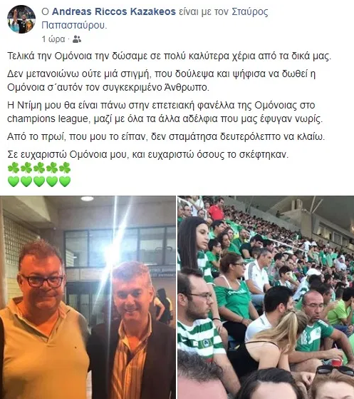 Εξέφρασε τα συναισθήματα του ο Ρίκκος Καζακαίος μέσα από ανάρτηση του στο Facebook, για την κίνηση της ΟΜΟΝΟΙΑΣ να δώσει χώρο στη φανέλα της, στην γυναίκα του Ντίμη η οποία έφυγε πρόσφατα από τη ζωή.