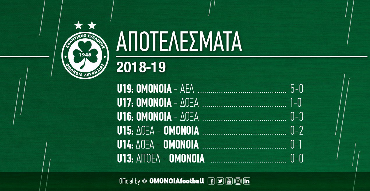 Μεγάλη νίκη πέτυχε πριν από λίγο η ΟΜΟΝΟΙΑ U19 καθώς επιβλήθηκε της ΑΕΛ με 5-0 στο «Ηλίας Πούλλος» για την 20η αγωνιστική. Η ομάδα μας άρχισε τον αγώνα με τους Νικολάου, Φώτη, Γαβριήλ, Λεμέσιος, Αυλωνίτης, Παναγή, Κακουλλής Γ., Ποντικός, Χαραλάμπους Χ., Πατσής και Κακουλλής Α. ενώ ως αλλαγή έπαιξαν οι Λοΐζου, Ιακώβου και Χριστοδούλου. Το πρώτο ημίχρονο τέλειωσε χωρίς γκολ, με την ομάδα μας να ανεβάζει στροφές στο δεύτερο μέρος και να φτάνει σε μια ευρεία νίκη που την διατηρεί στην κορυφή. Δύο γκολ πέτυχε ο Γιώργος Ποντικός ενώ από ένα οι Χαράλαμπος Χαραλάμπους, Λοΐζος Λοΐζου και Γιώργος Κακουλλής. Η νίκη αυτή ανέβασε την ΟΜΟΝΟΙΑ U19 στους 50 βαθμούς με απολογισμό 16 νίκες, 2 ισοπαλίες και 2 ήττες. Το ερχόμενο Σάββατο οι «πράσινοι» θα δώσουν νοκ άουτ αγώνα κυπέλλου στη Λεμεσό με τον Απόλλωνα. Για το πρωτάθλημα ακολουθεί σε δύο εβδομάδες το ντέρμπι με τον Αποέλ εκτός έδρας.