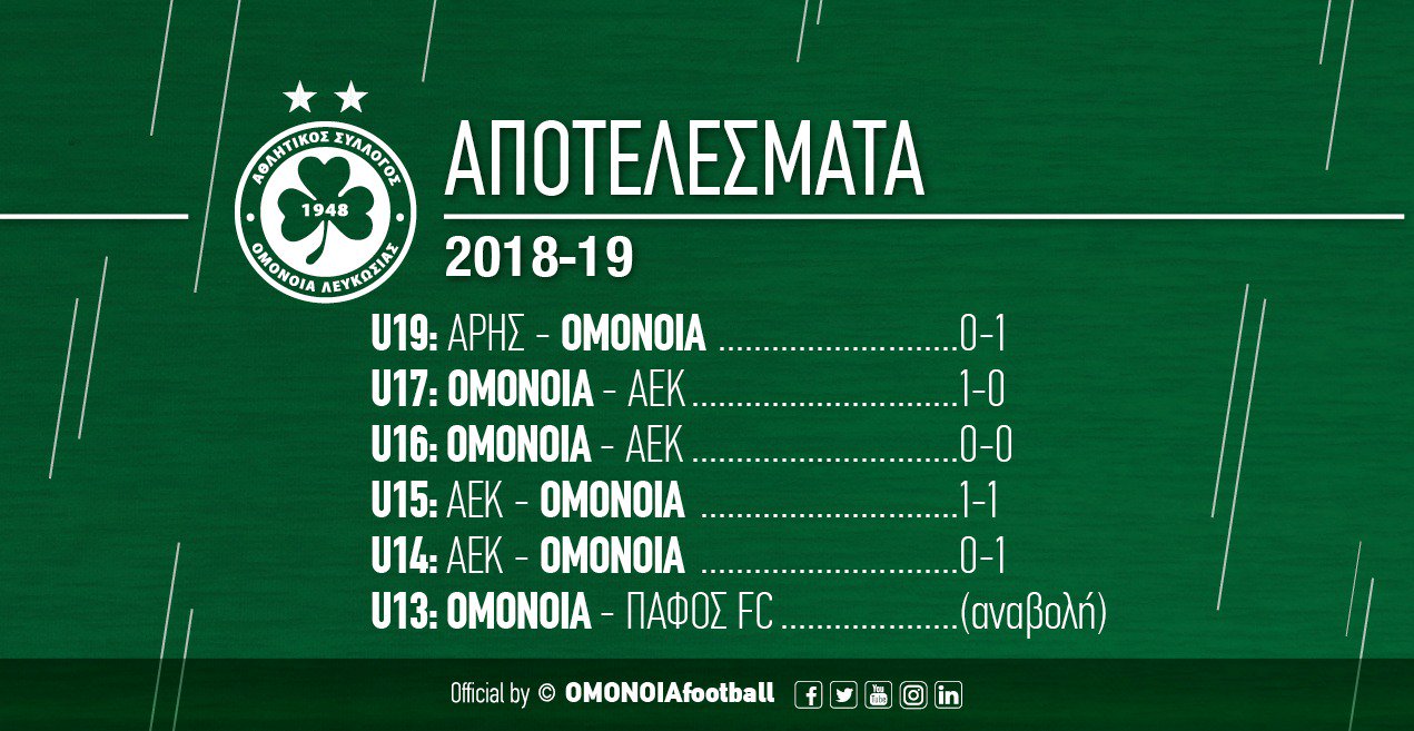 Τις δύο νίκες σε ισάριθμους αγώνες έφτασε σήμερα η ΟΜΟΝΟΙΑ U17. Οι «πράσινοι» κέρδισαν την ΑΕΚ με 1-0 για τη 2η αγωνιστική της β’ φάσης του πρωταθλήματος. Τους πρώτους ένδεκα του «τριφυλλιού» αποτέλεσαν οι Θεοχάρους, Φιλίππου, Κυριάκου, Χρίστου Σ., Γεωργίου, Φώτη, Χρίστου Κ., Λοΐζου, Ποντικός και Ζευκής ενώ ως αλλαγή πέρασε στον αγώνα ο Κουλουμπρής. Το γκολ που έδωσε τη νίκη πέτυχε στο 36’ ο Άγγελος Ζευκής. Η ΟΜΟΝΟΙΑ έφτασε στους 6 βαθμούς σε δύο αγώνες και αρχίζει να σκέφτεται την εκτός έδρας αναμέτρηση με την ΑΕΛ το ερχόμενο Σάββατο.