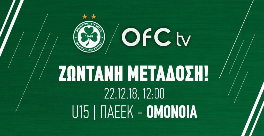 Ζωντανά μέσω της επίσημης ιστοσελίδας, www.omonoiafc.com.cy και του OFC TV θα προβληθεί ο αγώνας της ΟΜΟΝΟΙΑΣ U15 με αντίπαλο την ΠΑΕΕΚ, που θα διεξαχθεί το ερχόμενο Σάββατο (22/12) και θα ξεκινήσει στις 12:00.