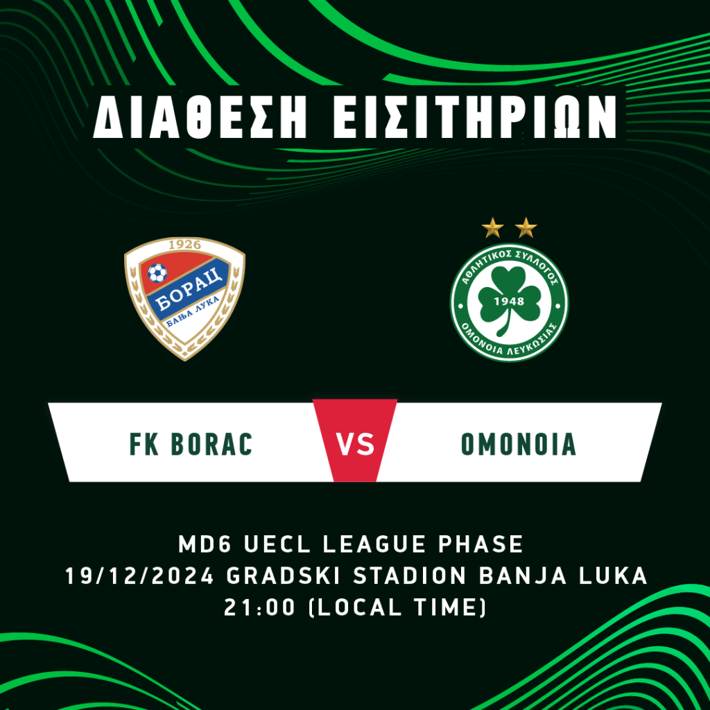 Από τη Δευτέρα, 9 Δεκεμβρίου, στις 11:00, διατίθενται τα εισιτήρια του αγώνα με την FK Borac, που θα διεξαχθεί την Πέμπτη, 19 Δεκεμβρίου, στο στάδιο «Gradski», της πόλης Banja Luka της Βοσνίας και Ερζεγοβίνης.