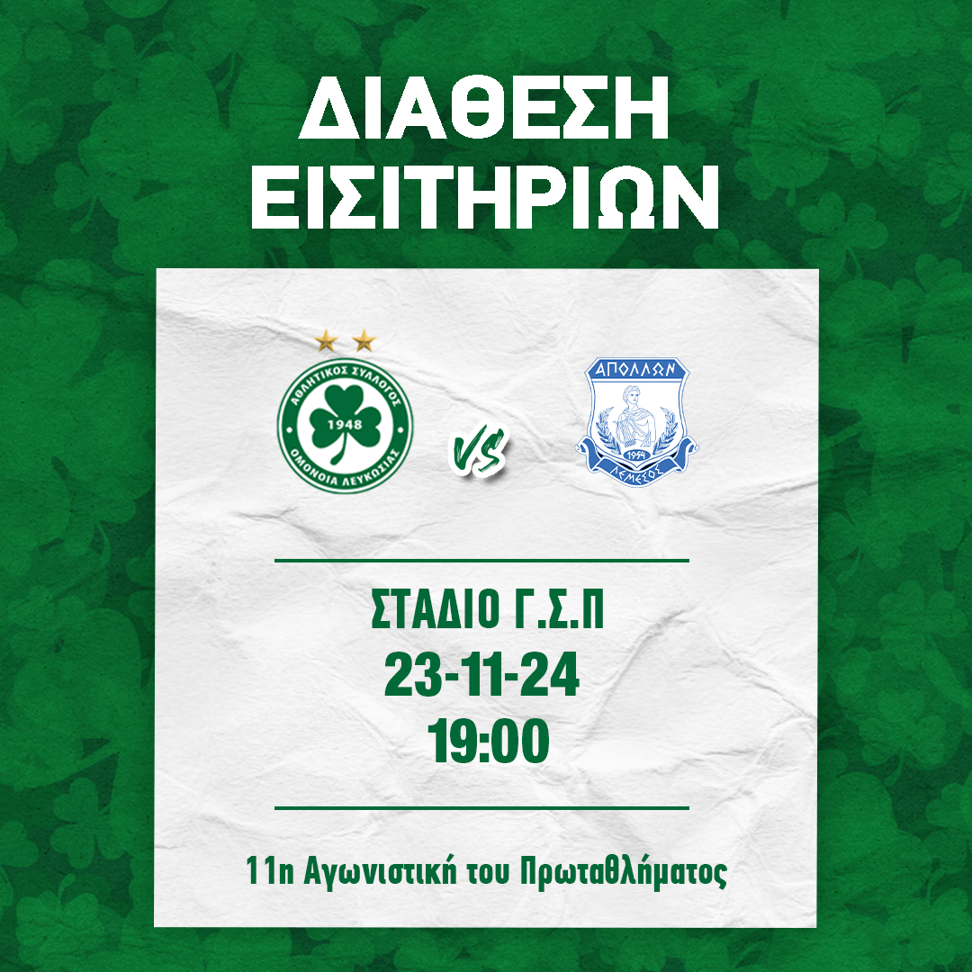 Από τη Δευτέρα, 18 Νοεμβρίου, στις 10:00, διατίθενται τα εισιτήρια για την 11η αγωνιστική του πρωταθλήματος με αντίπαλο τον Απόλλωνα, ο οποίος θα διεξαχθεί το Σάββατο, 23 Νοεμβρίου στο στάδιο ΓΣΠ και θα αρχίσει στις 19:00.