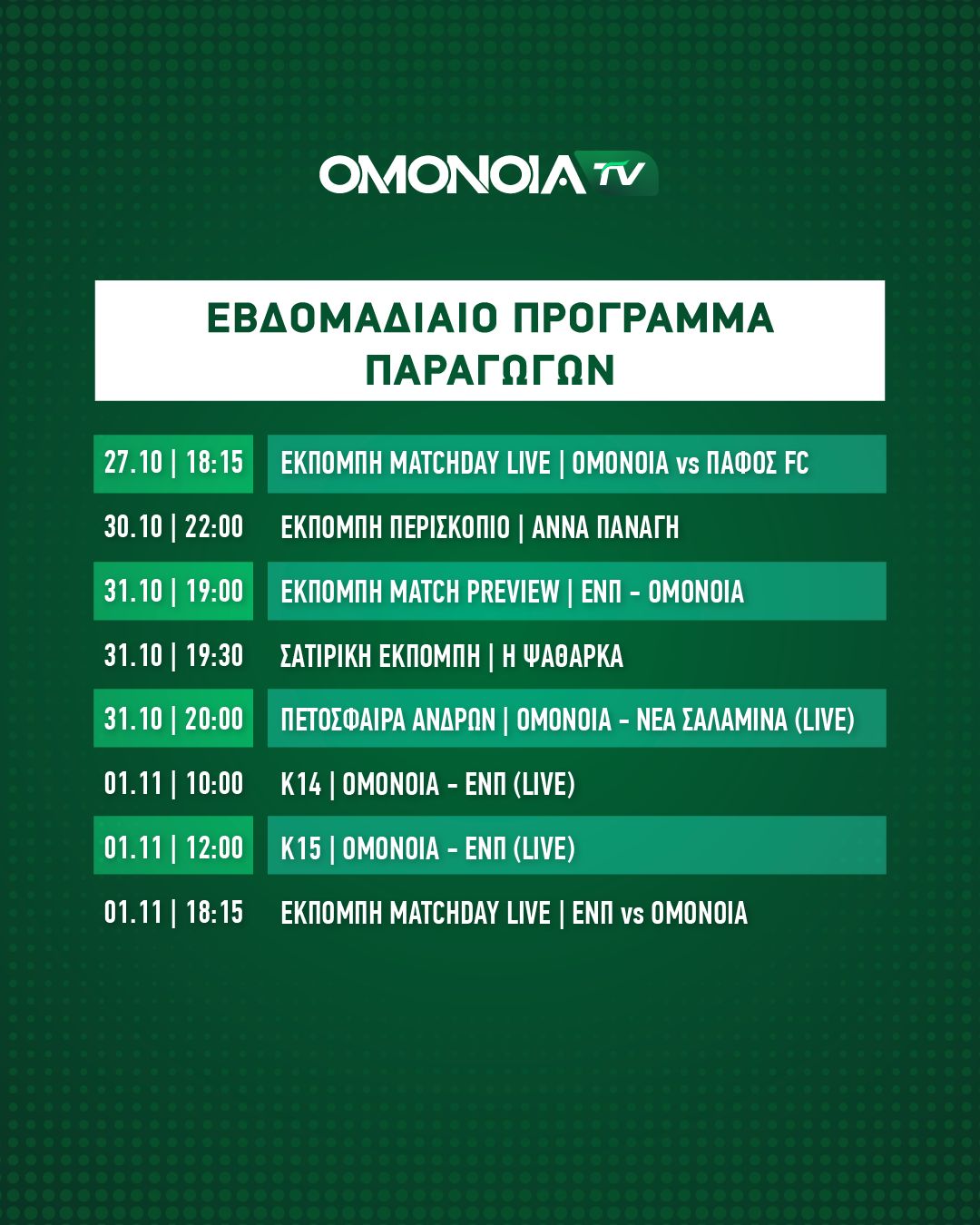 Home TOP NEWS Το εβδομαδιαίο πρόγραμμα του ΟΜΟΝΟΙΑ TV TOP NEWSΑΛΛΑ ΤΜΗΜΑΤΑΠΟΔΟΣΦΑΙΡΟ Το εβδομαδιαίο πρόγραμμα του ΟΜΟΝΟΙΑ TV 15:31 Oct 29, 2025 FacebookTwitterViberWhatsApp Η ΟΜΟΝΟΙΑ δημοσίευσε το εβδομαδιαίο πρόγραμμα με τις εκπομπές του OMONOIA TV. Αναλυτικά: RELATED ARTICLESMORE FROM AUTHOR Στόχος να ανοίξει τον Β’ γύρο όπως έκλεισε τον πρώτο Συνέχεια στην 14η αγωνιστική με τρείς αναμετρήσεις [Πρόγραμμα και τηλεοπτικές μεταδόσεις] Ολοκληρώνεται η προετοιμασία για το ματς με την ΑΕΚ Ο Air Francis της Ευρώπης! Σαν έτοιμος από καιρό! UEFA: Τα κριτήρια ισοβαθμίας στο Conference League Το τρελό ξέσπασμα του Ηλία: Βρέθηκε στην κερκίδα μετά το buzzer beater! [Βίντεο] Στη διάθεση του Λαού τα εισιτήρια με Ρακόφ στο ΓΣΠ [Λεπτομέρειες] Απολαύστε υπεύθυνα: Το φωτορεπορτάζ (της χρονιάς) από την πράσινη κατάληψη της Βιέννης!