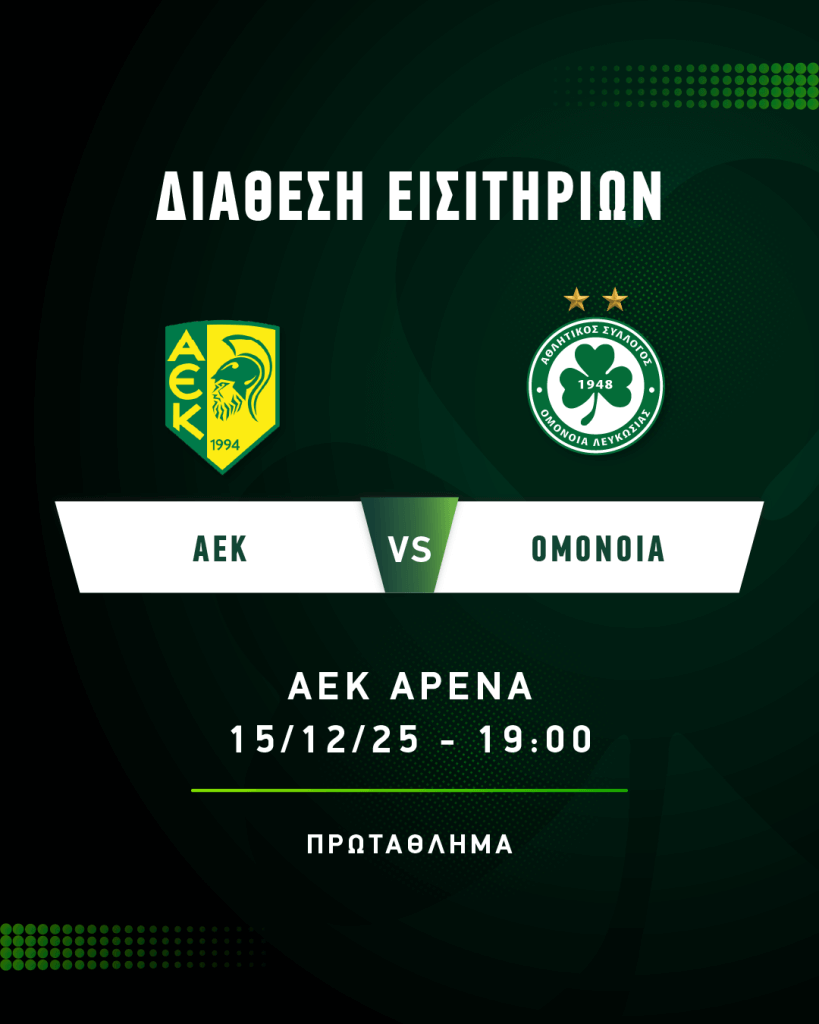 Από την Τετάρτη (10/12), στις 10:00, διατίθενται τα εισιτήρια του αγώνα με την ΑΕΚ στο στάδιο ΑΕΚ Αρένα, για την 14η αγωνιστική του πρωταθλήματος.